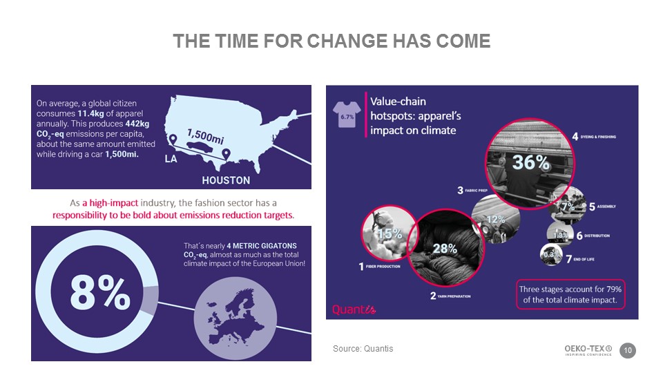 瑞士紡織檢定有限公司CMO Marc Sidler主題分享了《綠色認(rèn)證賦能產(chǎn)業(yè)新發(fā)展》,從紡織檢定視角談可持續(xù)發(fā)展對(duì)紡織產(chǎn)業(yè)的意義?!巴该?、可追溯是最熱門的詞,但同時(shí)對(duì)于行業(yè)來說也很重要,因?yàn)橄M(fèi)者非常關(guān)心?!盡arc Sidler很直觀地指出,紡織產(chǎn)業(yè)對(duì)生態(tài)環(huán)境以及人的生存生活有很大影響,例如紡織品中的成分含量,還有如染整環(huán)節(jié)一樣的各種排放,“要讓消費(fèi)者做出負(fù)責(zé)任的決定,幫助公司做出負(fù)責(zé)任的決定。”他結(jié)合專業(yè)數(shù)據(jù)進(jìn)行分析,綠色發(fā)展對(duì)于生態(tài)環(huán)境至關(guān)重要,而紡織行業(yè)不僅不應(yīng)該與之對(duì)立,還應(yīng)該從供應(yīng)鏈多環(huán)節(jié)展現(xiàn)出兩者的相融,Marc Sidler表示,消費(fèi)者以及更大范圍的時(shí)尚行業(yè),都對(duì)“透明、可追溯”等可持續(xù)熱點(diǎn)很關(guān)注,所以,能夠證明產(chǎn)品可追溯的機(jī)構(gòu)、技術(shù)等的就越來越重要,不僅從耗水量、碳排放量等維度去量化,還要從整體的生活環(huán)境來考量,紡織檢定對(duì)于優(yōu)秀的、順應(yīng)人與自然正確發(fā)展規(guī)律的企業(yè)而言,是助力,也是見證者,這些對(duì)于中國(guó)市場(chǎng)而言越來越重要。