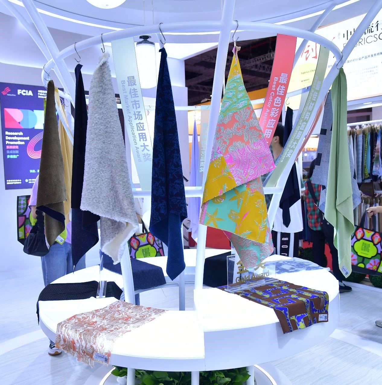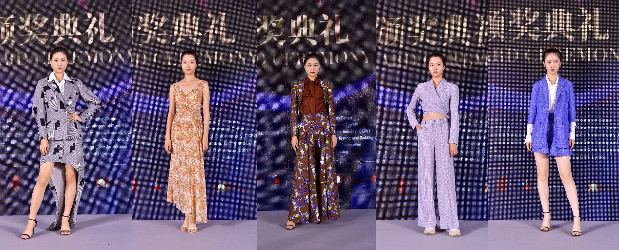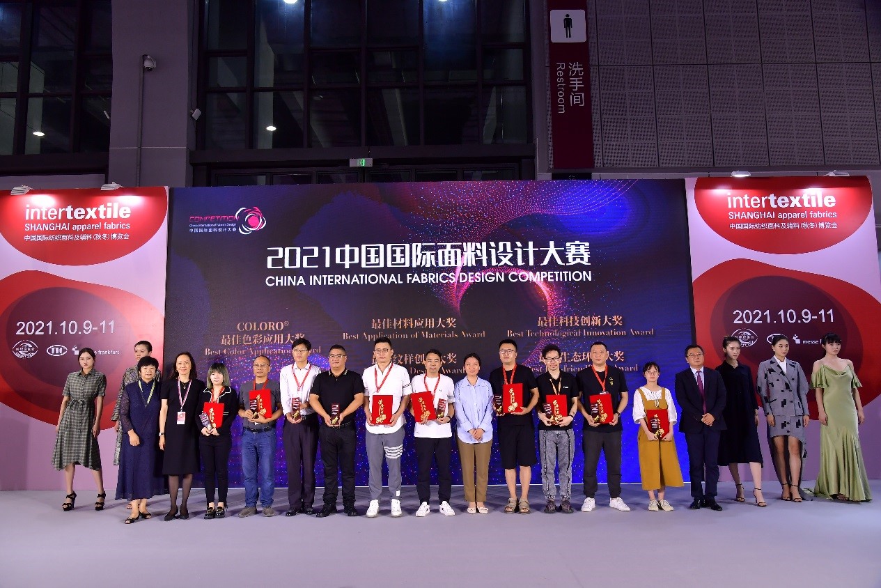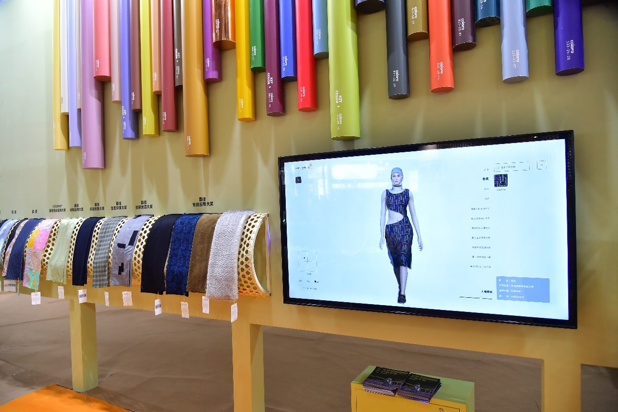 在intertextile面輔料展上,大賽獲獎(jiǎng)成果多處呈現(xiàn):頒獎(jiǎng)典禮上獲獎(jiǎng)面料的成衣展示、數(shù)字面料與虛擬服裝展示;中國(guó)紡織信息中心展位“中國(guó)流行面料”專區(qū);“2022/23秋冬中國(guó)紡織面料流行趨勢(shì)發(fā)布區(qū)”的獲獎(jiǎng)產(chǎn)品展示專區(qū)。