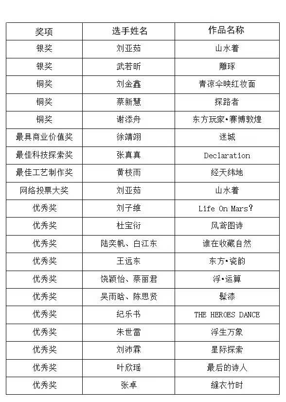 20組入圍選手作品進(jìn)行巔峰對(duì)決,以靜態(tài)展的形式全方位展示設(shè)計(jì)亮點(diǎn),經(jīng)過評(píng)委們公平、公正、公開評(píng)審,8號(hào)選手劉亞茹的作品《山水著》、14號(hào)選手武若昕的作品《雕琢》摘得銀獎(jiǎng),6號(hào)選手劉金鑫的作品《青涼傘映紅妝面》、1號(hào)選手蔡新慧的作品《探路者》、15號(hào)選手謝添舟的作品《東方玩家•賽博敦煌》榮獲銅獎(jiǎng)。