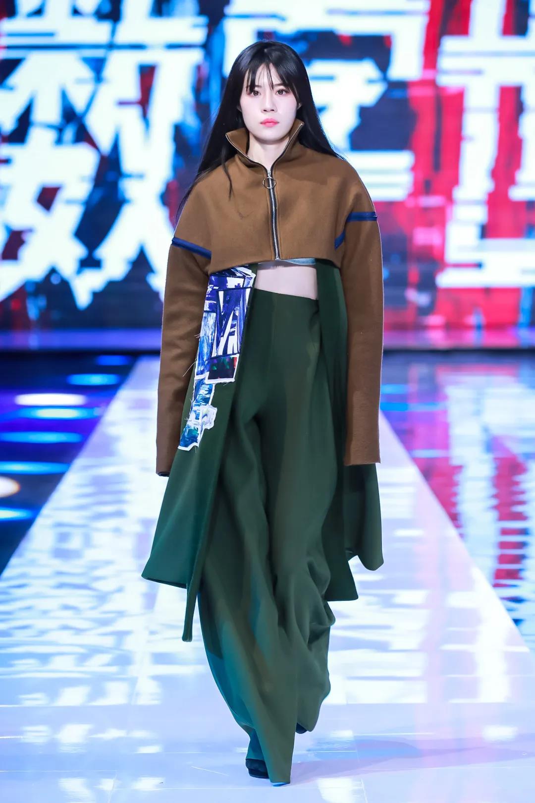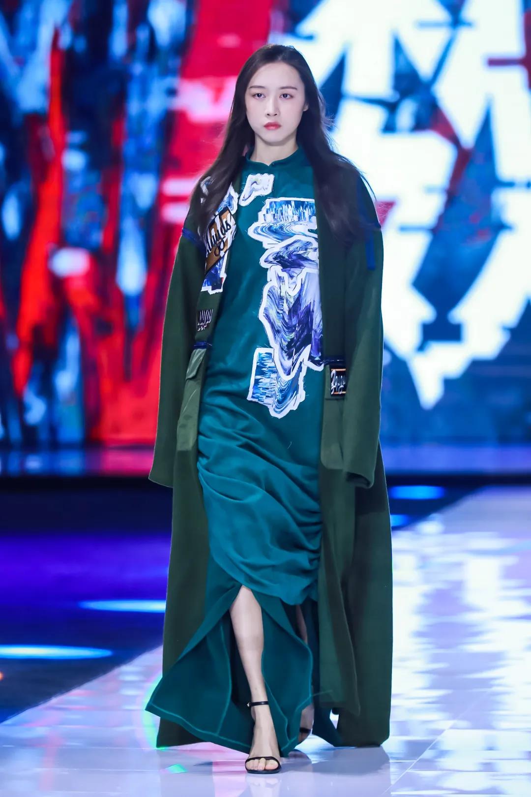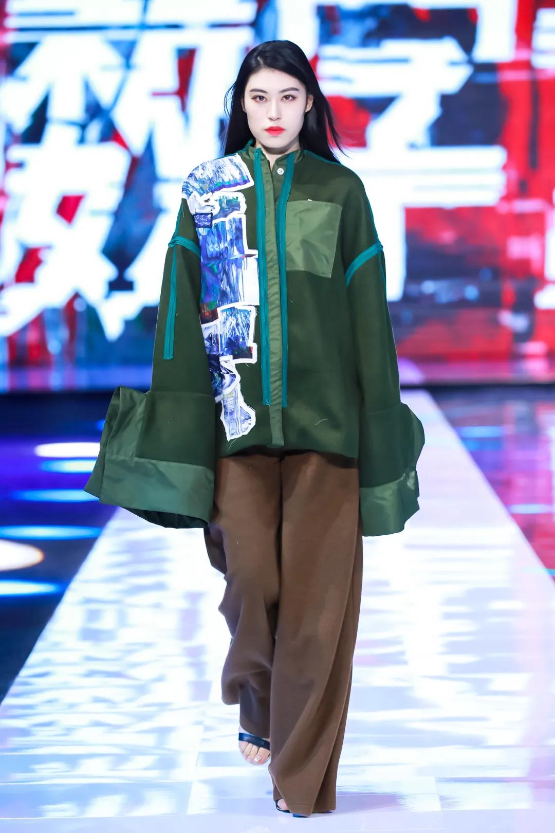 第二系列以綠色調(diào)為主,保留中式服裝寬衣博袖的特點(diǎn),選用寬松平板的服裝版型,搭配多種質(zhì)感的面料營造出層次感,再加入電子切割的異形布貼,將設(shè)計(jì)師的抽象繪畫與數(shù)字化融合,使用色彩分離與位移的處理,呈現(xiàn)出數(shù)字化世界特殊的電波與色彩的動(dòng)感。
