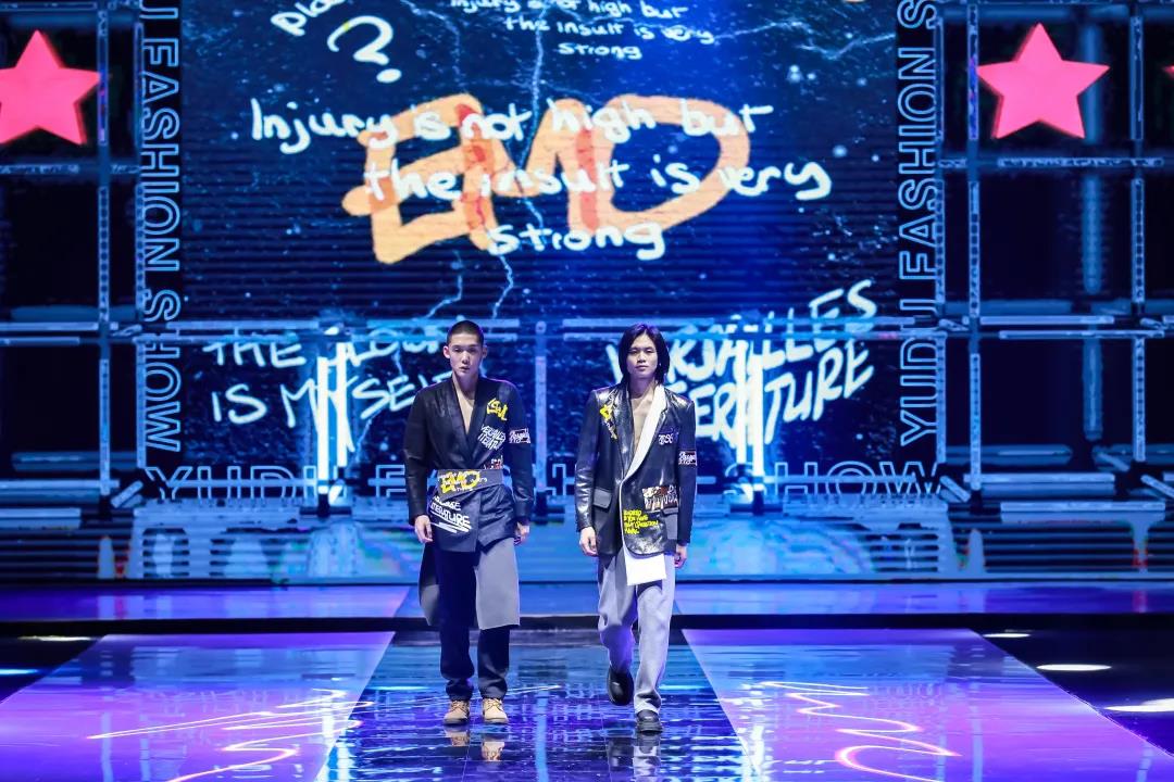 本次發(fā)布秀主題以數(shù)字化世界為創(chuàng)作靈感,將藝術(shù)與數(shù)字世界的關(guān)系作為中心,以數(shù)字世界里RGB光模式里的三原色,藍(lán)、綠、紅為主色調(diào),再以設(shè)計(jì)師的抽象繪畫作品作為基礎(chǔ),加入RGB顏色分離、圖像位移等視覺處理,將抽象繪畫作品的結(jié)構(gòu)與色彩進(jìn)行數(shù)碼化的二次抽象,再將圖案以不同大小的形狀用以藝術(shù)拼貼的方式融入到服裝上,表達(dá)數(shù)字化世界里被屏幕充斥視覺的感受。