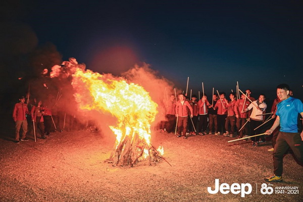 第一天進(jìn)行29KM的徒步,路過靜謐佇立的漢長城遺址和疏勒河,在二里半戈壁的星空營地,9點(diǎn)湛藍(lán)天空漸漸轉(zhuǎn)暗的時(shí)候,開始篝火晚會(huì)。在晚會(huì)的添柴儀式上,Jeeper們一起添柴為品牌助力,寓意事業(yè)紅紅火火,慶祝Jeep品牌80周年,開啟對(duì)未來的無限向往。在具有敦煌民族特色的歌舞表演后,12個(gè)隊(duì)輪番派隊(duì)員上臺(tái)演出,各隊(duì)都藏龍臥虎,為我們獻(xiàn)上動(dòng)人歌聲。煙花伴隨全場互動(dòng)舞蹈,最后黑撒樂隊(duì)的大治受到全場氛圍渲染,即興現(xiàn)場打碟點(diǎn)燃全場氛圍,晚會(huì)氣氛迅速飆升進(jìn)入狂歡模式。
