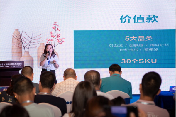發(fā)布會現場,華燈璀璨音樂激揚。公司執(zhí)行董事郭杰發(fā)表熱情洋溢的講話。全國勞動模范、際華3542公司布機車間教練工劉沙上臺為際華家紡代言。