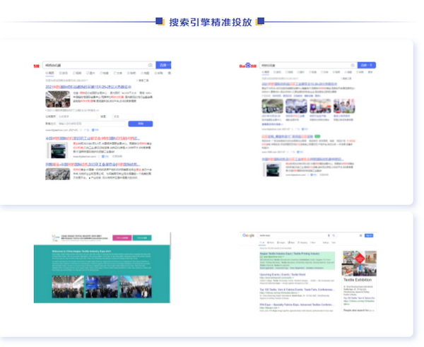 ▼展會(huì)在各大搜索引擎,如百度、谷歌、必應(yīng)等主流平臺(tái)精準(zhǔn)投放詞條熱搜,確保各領(lǐng)域觀眾至現(xiàn)場參觀采購。