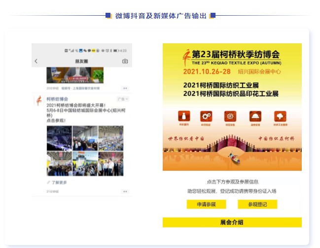 ▼2021秋季柯橋紡機(jī)及印花展全新規(guī)劃營銷推廣計(jì)劃。針對(duì)線上線下各專業(yè)及大眾領(lǐng)域渠道進(jìn)行細(xì)化型擴(kuò)展,多維度開展精準(zhǔn)全方位市場營銷。