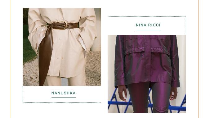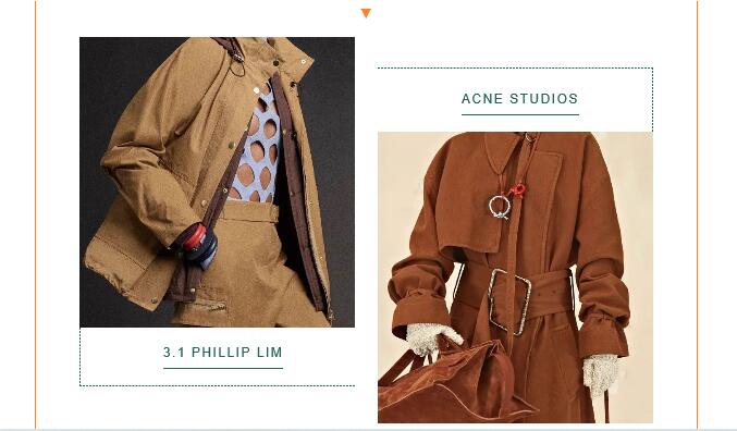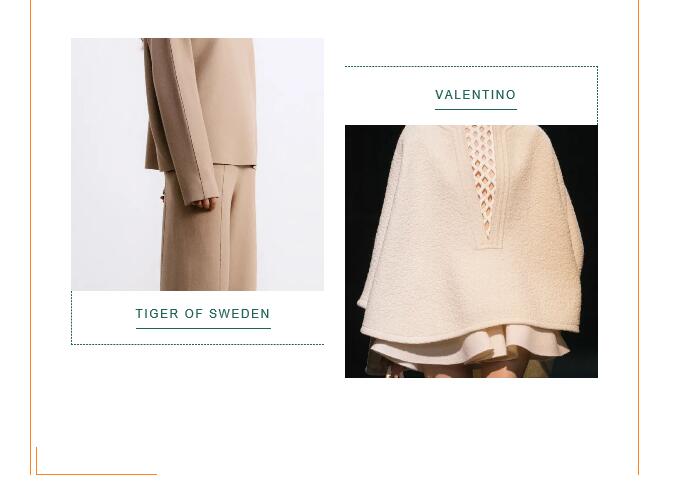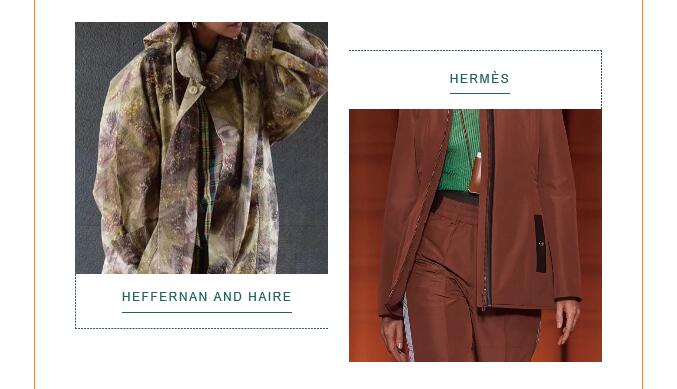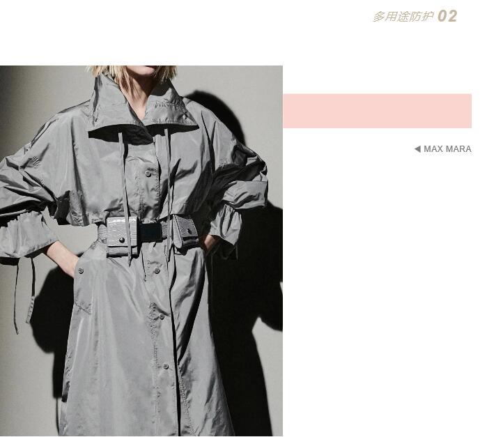 將專業(yè)的防護(hù)性能融入日常著裝設(shè)計,結(jié)合都市風(fēng)格與戶外審美為日常服裝增值成為本季新的創(chuàng)新途徑。棉質(zhì)面料以棉/滌、棉/錦等材質(zhì)為主,啞光光潔表面展現(xiàn)精致化外觀,紙感涂層、微皺表面、壓褶紋理表達(dá)對精致自然的追求;滌綸或尼龍面料如塔夫綢等結(jié)構(gòu)致密、光澤閃亮,防護(hù)性涂層賦予其防風(fēng)防水、耐久耐穿等性能,用于打造都市造型的風(fēng)衣、夾克套裝等,實現(xiàn)時裝與戶外功能性的融合,如Max Mara、Hermès;高性能羊毛成為開發(fā)熱點,如ICICLE通過使用OptimTM專利技術(shù)超細(xì)羊毛開發(fā)高支高密純毛面料,在保持產(chǎn)品高端質(zhì)感的同時,賦予其防風(fēng)防水、抗皺、透氣、控溫等功能性,真正實現(xiàn)辦公、休閑、戶外的一衣多用性。