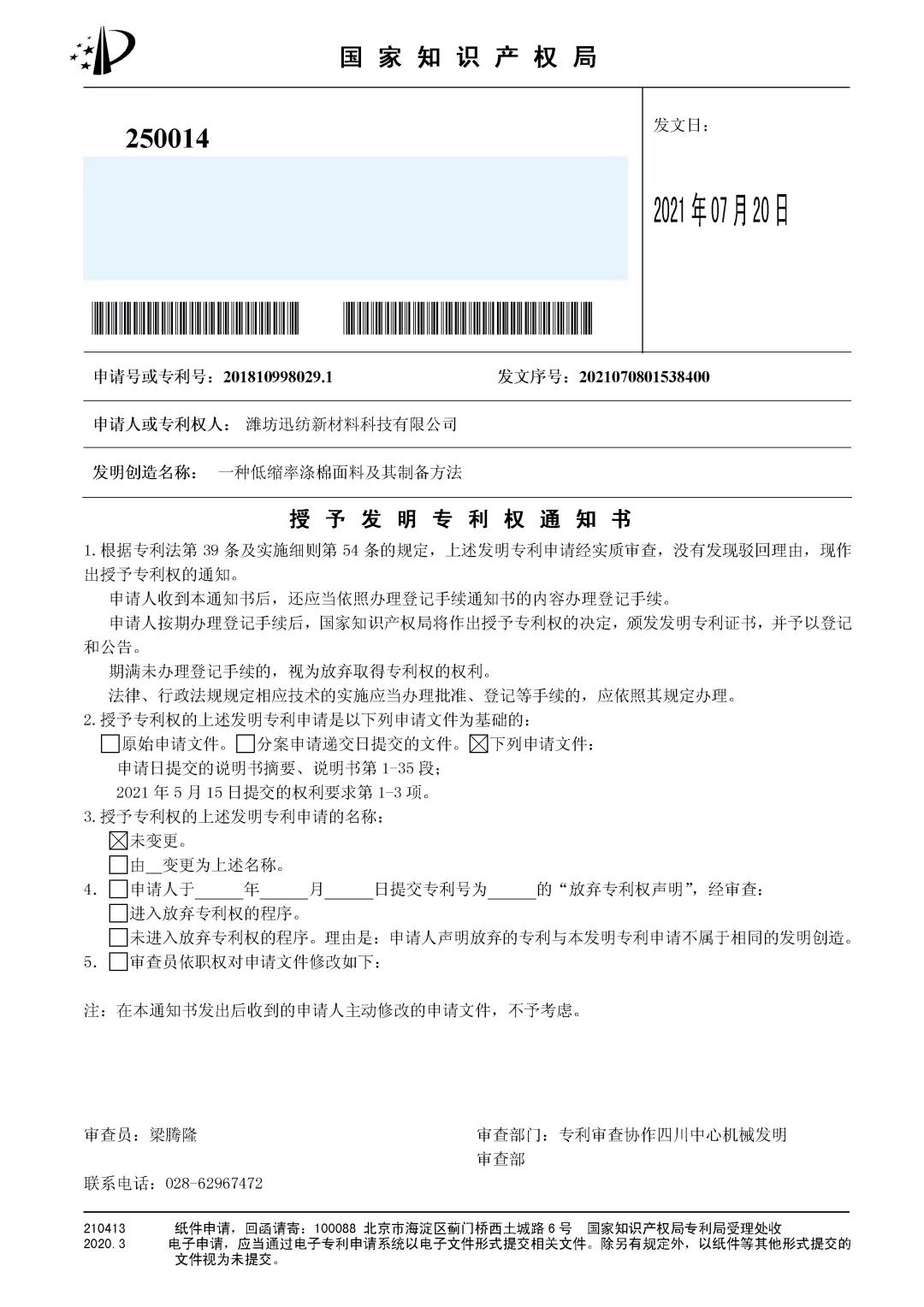 近日,國家知識產(chǎn)權(quán)局對濰坊迅紡新材料科技有限公司申請的“一種低縮率滌棉面料及其制備方法”作出授予發(fā)明專利權(quán)的決定,并頒發(fā)發(fā)明專利證書。