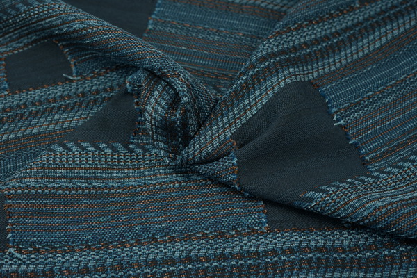 點(diǎn)評(píng):回歸手工藝術(shù)與民俗美學(xué),通過雪尼爾紗線的加入,結(jié)合剪花工藝和大提花組織結(jié)構(gòu)設(shè)計(jì),呈現(xiàn)夕陽余波般的凹凸感手工編織紋理和創(chuàng)意拼補(bǔ)效果,展現(xiàn)懷舊節(jié)儉老土布風(fēng)格的升級(jí)再造。