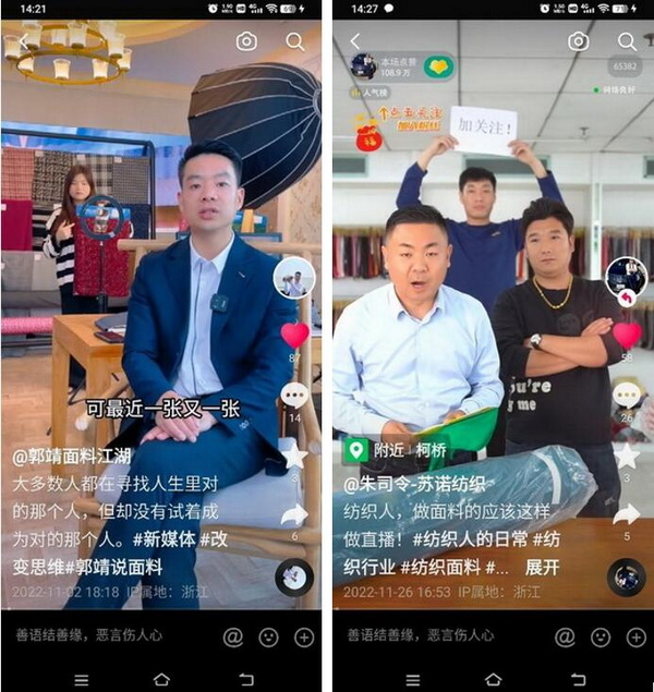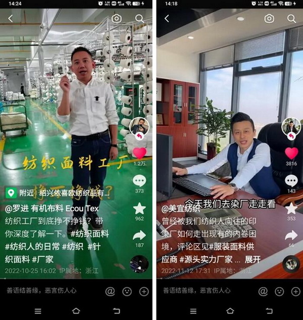 “互聯(lián)網(wǎng)+媒體與手機等智能化設(shè)備,改變了‘人、貨、場’之間的關(guān)系。建立適應(yīng)直播電商的新零售模式,迫在眉睫??聵蛑袊p紡城產(chǎn)業(yè)基礎(chǔ)雄厚,紡織配套十分完善,直播電商環(huán)境相對成熟,目前眾多紡織企業(yè)也在積極嘗試抖音直播進行企業(yè)宣傳和產(chǎn)品營銷,且取得不錯的效果?!?