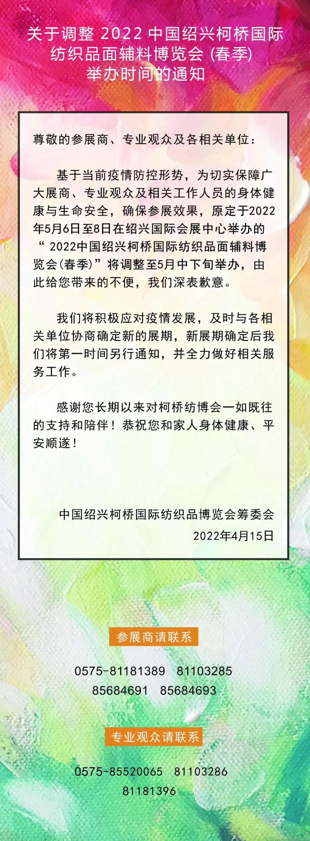 關(guān)于調(diào)整2022中國紹興柯橋國際紡織品面輔料博覽會(春季)舉辦時間的通知