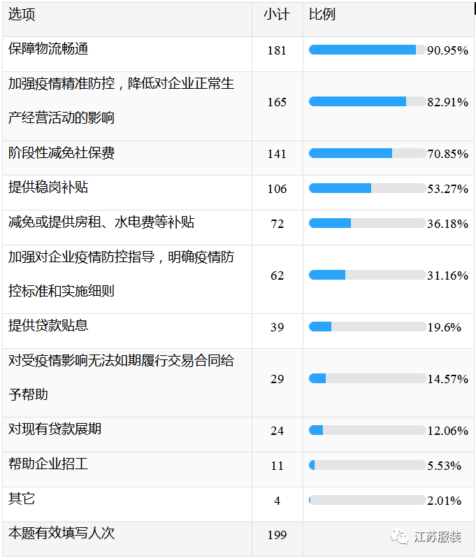 調(diào)查顯示,在所有選項中,排在前五位的是:“保障物流暢通”、“加強疫情精準(zhǔn)防控,降低對企業(yè)正常生產(chǎn)經(jīng)營活動的影響”、“階段性減免社保費”、“提供穩(wěn)崗補貼”、“減免或提供房租、水電費等補貼”。