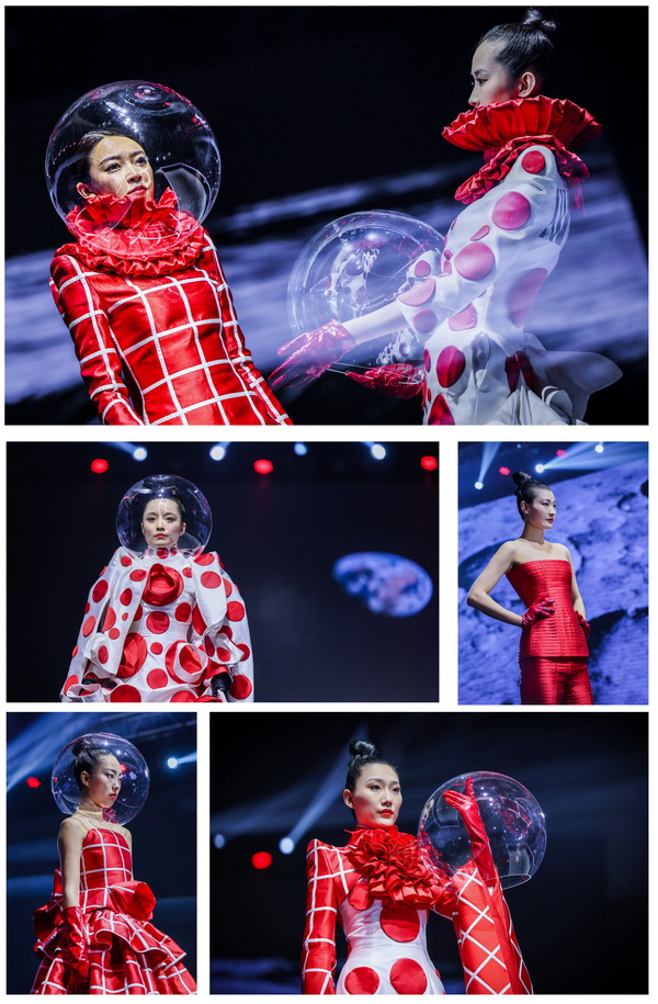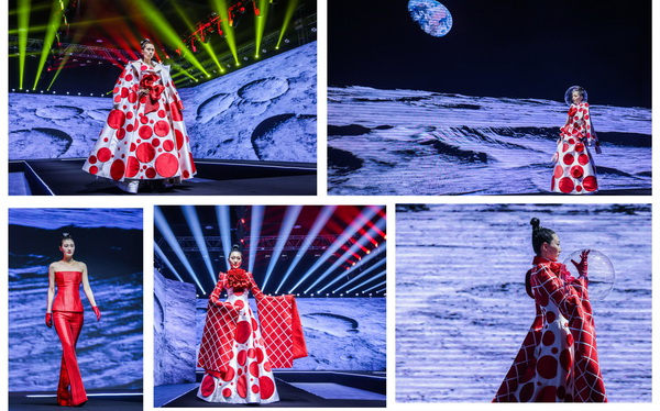 本次跨界大秀胡社光親自構(gòu)思設(shè)計(jì)主題定制服裝,設(shè)計(jì)過(guò)程中緊密結(jié)合發(fā)布會(huì)主題、兩大篇章八大類流行纖維的內(nèi)涵外延,盡顯纖維之美、纖維之魅。在纖•自然本源篇大秀中,我們看到身穿東方傳統(tǒng)服飾的少女,從巍巍青山中徐徐走來(lái),無(wú)處不彰顯著自然之美,非遺漢繡老繡片與高定服裝的完美結(jié)合,更使悠悠纖絲貫穿古今,奔向未來(lái)。在纖•蝶變新生篇大秀中,胡社光以未來(lái)宇宙為主題--織-天宮,以“無(wú)界與共行”為設(shè)計(jì)理念,以同色系的撞色拼接設(shè)計(jì)更彰顯了一種簡(jiǎn)約卻又富有層次的時(shí)尚之美、夢(mèng)幻之美。