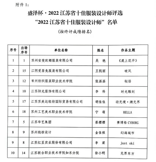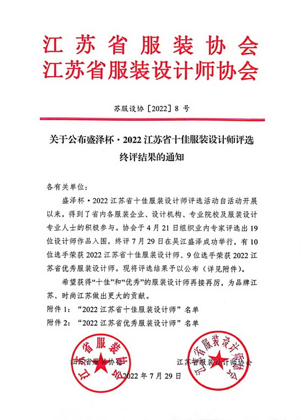 附件:關(guān)于公布盛澤杯.2022江蘇省十佳服裝設(shè)計(jì)師評(píng)選終評(píng)結(jié)果的通知