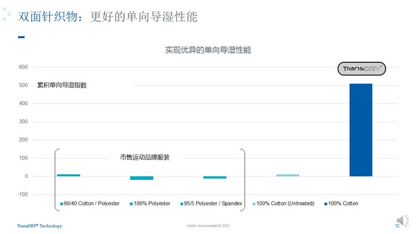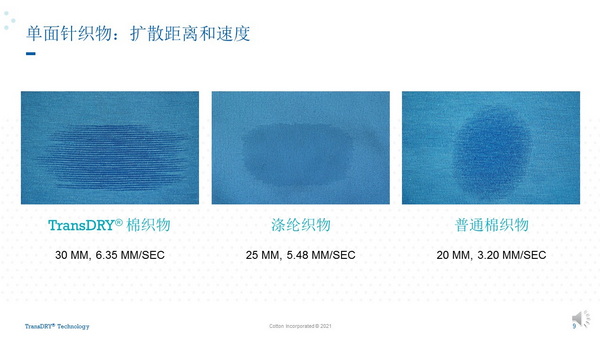 莊德華首先分享了三種在棉質(zhì)面料上實現(xiàn)濕氣管理性能的整理技術(shù)。其中,TransDRY™技術(shù)通過將特殊拒水加工后的棉紗與普通紗線交織排列,起到了吸濕、排汗和快干的作用?!霸擁椉夹g(shù)的關(guān)鍵在于紗線處理,可通過不同排紗方式,實現(xiàn)汗液/濕氣從橫向、縱向到由內(nèi)到外的單向?qū)窆δ?,不同的織物結(jié)構(gòu)會有不同的性能表現(xiàn)。”