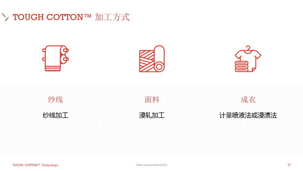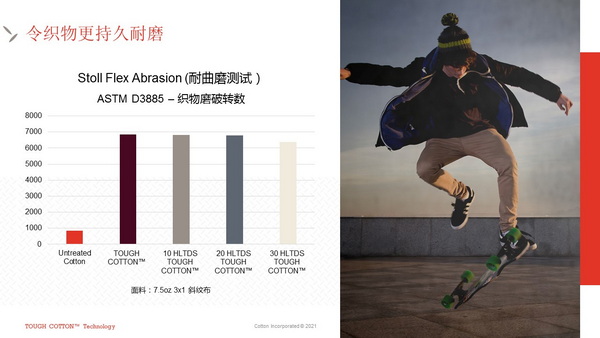 莊德華指出,該項技術(shù)采用的聚乙烯軟油能夠提高面料的耐磨性及撕破強力,交聯(lián)劑(PBI)則提高了面料的功能耐久性?!皩τ赥OUGH COTTON™,我們有嚴(yán)格的性能指標(biāo),需要處理后的面料經(jīng)過20次洗烘之后,耐磨程度較處理前的面料提高2倍以上才為合格?!?/span>