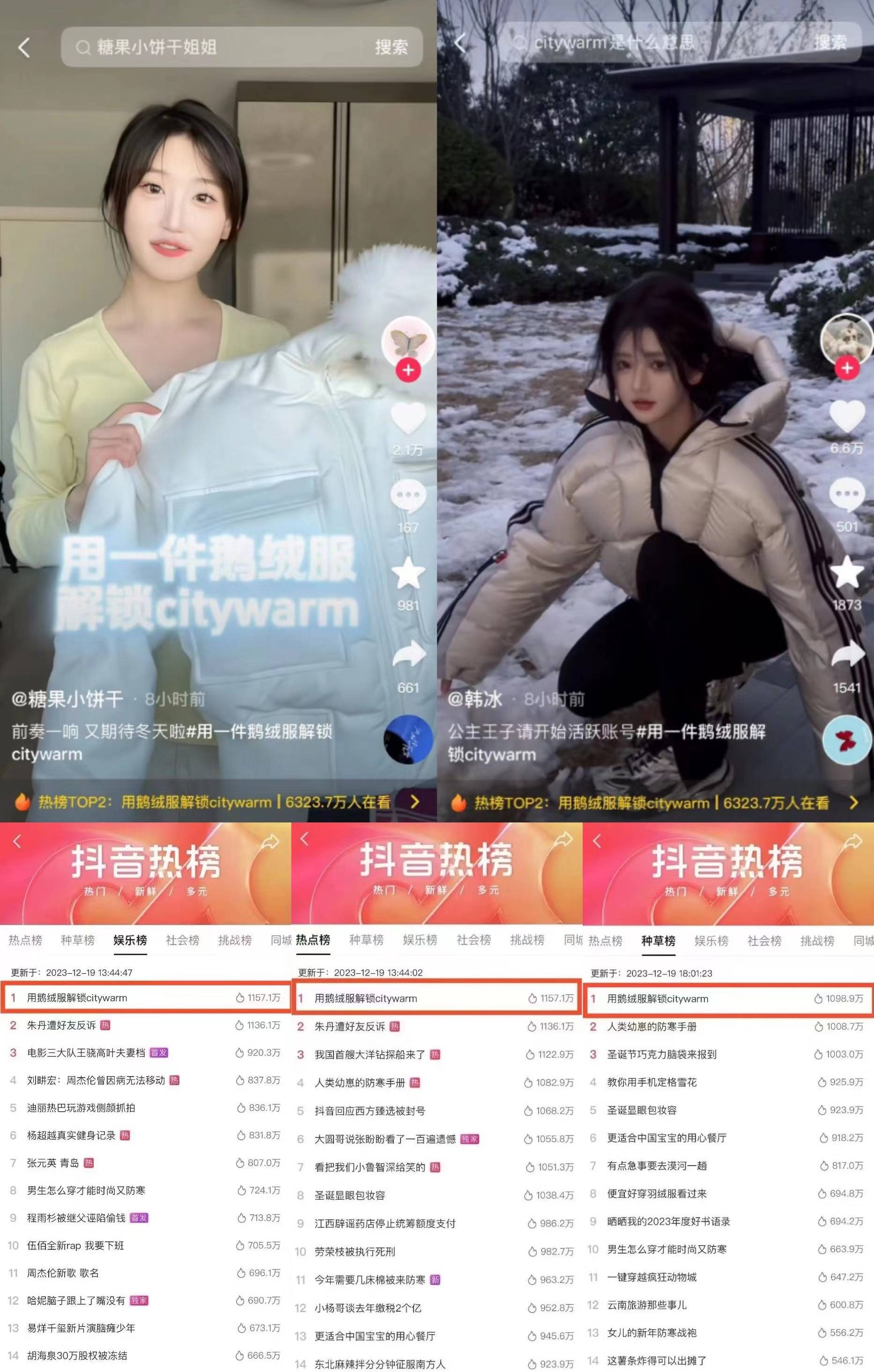 首先,直播發(fā)布會前期在抖音平臺發(fā)起了#用一件鵝絨服解鎖citywarm 挑戰(zhàn)賽話題,吸引了@蠟筆小新~、@韓冰 、@我叫Abbily(艾比)等平臺達人紛紛參與,以近期的大雪紛飛為種草背景,深度強化鵝絨服輕盈、保暖的優(yōu)勢亮點,并在評論區(qū)引導用戶關(guān)注中國新發(fā)布。挑戰(zhàn)賽話題一經(jīng)上線,便受到廣泛歡迎,同時登上抖音娛樂榜、熱點榜、種草榜榜單第一。