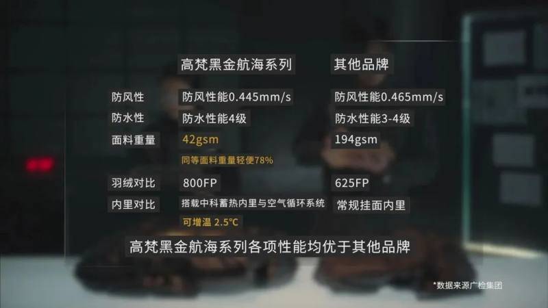 二是新品多角度的橫向直觀對比。對消費者而言,“事實勝于雄辯”。為此,《中國新發(fā)布》主題直播發(fā)布會現(xiàn)場,央視網(wǎng)以真實測試結(jié)果展現(xiàn)高梵品牌實力。在央視測試中,高梵黑金航海系列新品與國際大牌羽絨服共同面對面料性能、保溫性能、輕盈度、羽絨品質(zhì)等四個維度的測試,實驗結(jié)果顯示,高梵黑金航海系列新品在每項測試中均有更優(yōu)表現(xiàn),領(lǐng)先某品牌?,F(xiàn)場還發(fā)起測評小實驗,以更直觀的現(xiàn)場表現(xiàn),生動展現(xiàn)了高梵黑金航海系列新品更防寒、更輕盈、更保暖的產(chǎn)品實力。