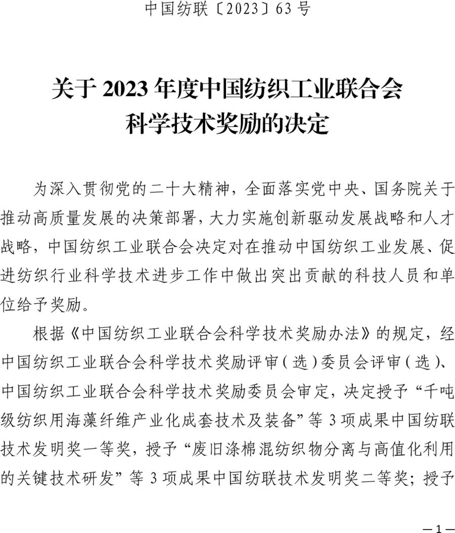 “科技創(chuàng)新是行業(yè)高質量發(fā)展的驅動力,大會的召開將進一步引領紡織行業(yè)的高質量發(fā)展,助力紡織科技強國建設。”12月6日,2023年度中國紡織工業(yè)聯(lián)合會科學技術獎勵大會在人民大會堂隆重召開。