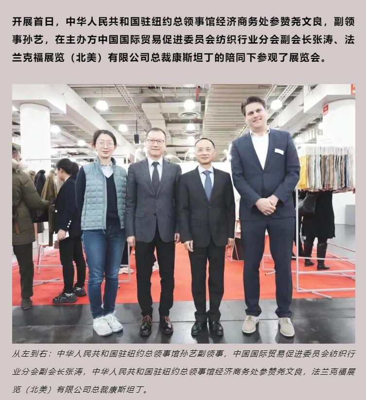 美國東部時間2023年1月31日上午10點,由中國紡織工業(yè)聯(lián)合會主辦,中國國際貿(mào)易促進(jìn)委員會紡織行業(yè)分會與法蘭克福展覽(北美)有限公司共同承辦的第二十四屆中國紡織品服裝貿(mào)易展覽會(紐約)China Textile and Apparel Trade Show (New York)暨紐約服裝面料展(TEXWORLD)、紐約國際服裝采購展(APPAREL SOURCING)(以下簡稱“紐約展”)在紐約曼哈頓賈維茨展覽中心拉開帷幕。作為“開年第一展,海外第一站”,本屆紐約展及時響應(yīng)、高效啟動,全面助力紡織服裝企業(yè)在2023年起步快跑,收獲海外商貿(mào)“開門紅”。