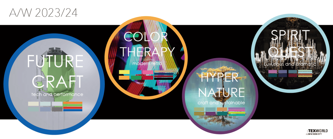 本屆紐約展現(xiàn)場開設(shè)趨勢靜態(tài)展示區(qū),引導(dǎo)企業(yè)把握最新時尚脈絡(luò),本屆展會現(xiàn)場還展出了2023至24秋冬色彩及面料趨勢趨勢,囊括“Future craft”、“Color therapy”、“Hyper nature”和“Spirit quest”四大主題,方便到場的展商及觀眾了解。