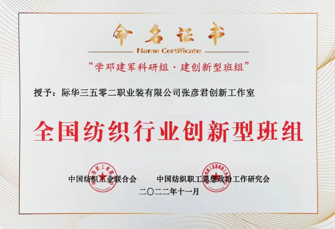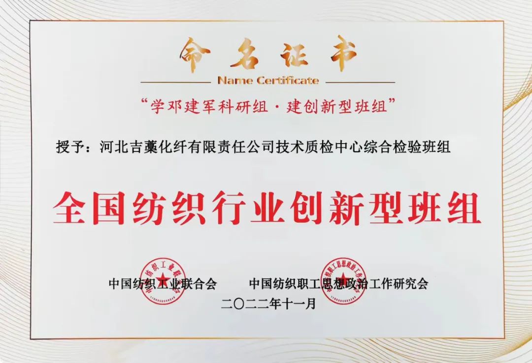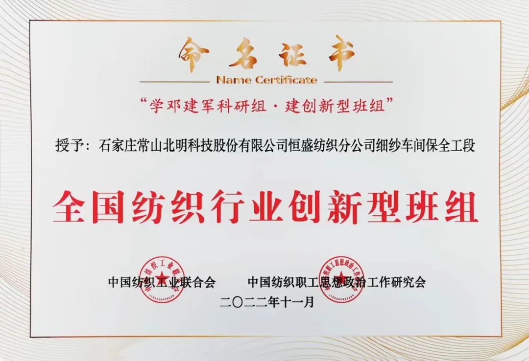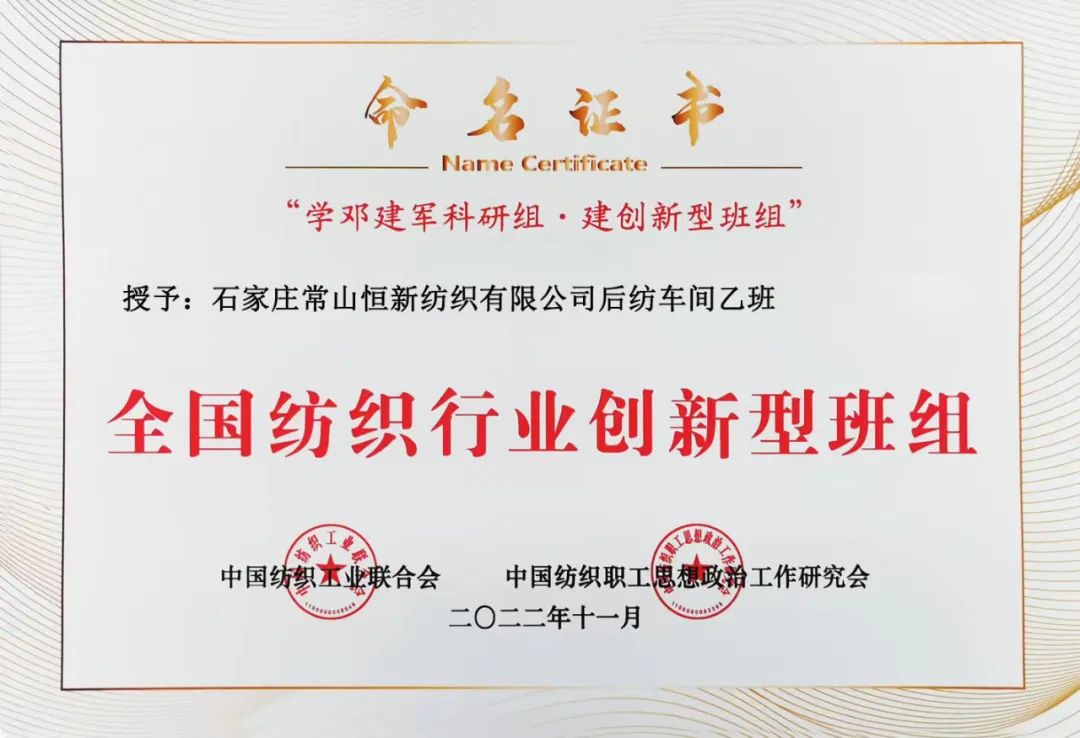 全國49個(gè)紡織班組被授予“2022年全國紡織行業(yè)創(chuàng)新型班組”,石家莊市紡織行業(yè)協(xié)會(huì)理事單位有4個(gè)班組榜上有名獲殊榮。他們是:石家莊常山北明科技股份有限公司恒盛紡織分公司細(xì)紗車間保全工段、石家莊常山恒新紡織有限公司后紡車間乙班、河北吉藁化纖有限責(zé)任公司技術(shù)質(zhì)檢中心綜合檢驗(yàn)班組、際華三五零二職業(yè)裝有限公司張彥君創(chuàng)新工作室。