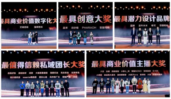 共計73位行業(yè)代表性企業(yè)及人物榮耀加身,分別摘取“匠人精神大獎”、“供應鏈創(chuàng)新大獎”、“最具商業(yè)價值MCN大獎”、“最具創(chuàng)意大獎”、“最具人氣新消費品牌大獎”、“年度爆品大獎”、“最具商業(yè)價值數(shù)字化大獎”、“最具潛力設計品牌大獎”、“優(yōu)秀供應商大獎”、“最具商業(yè)價值品牌服務商大獎”、“最具商業(yè)價值主播大獎”以及“最值得信賴私域團長大獎”等獎項。