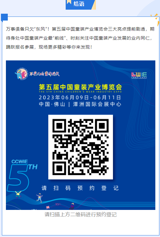 蓄勢勃發(fā)、萬眾期盼!第五屆中國童裝產(chǎn)業(yè)博覽會(huì)(縮寫:CCWIE,以下簡稱“童博會(huì)”)將于6月9-11日在廣東佛山潭洲國際會(huì)展中心舉辦!距離啟幕不足半月之際,從展商對接、活動(dòng)策劃,到專業(yè)觀眾邀約,2023“童博會(huì)”經(jīng)過有條不紊的前期準(zhǔn)備,已然整裝待發(fā),信心滿滿等待業(yè)界全方位考察與檢驗(yàn)。