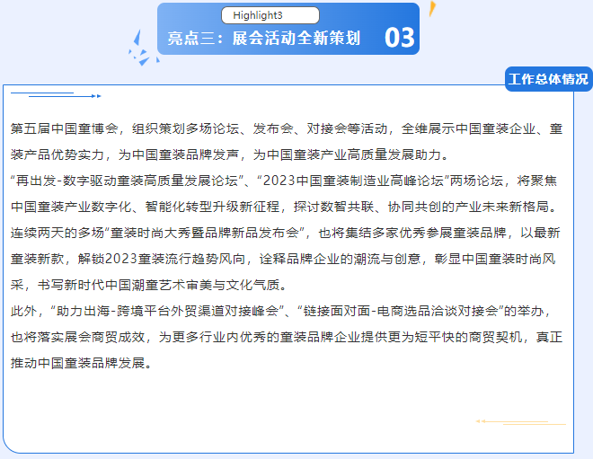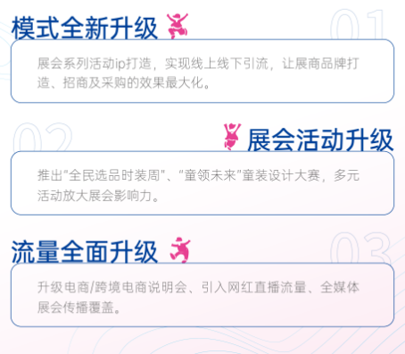 作為國內(nèi)最早專注于童裝產(chǎn)業(yè)的全產(chǎn)業(yè)鏈博覽會(huì),“童博會(huì)”以“童裝品牌·中國甄選”為核心,甄選中國童裝品牌,推動(dòng)及孵化中國優(yōu)秀童裝品牌,同時(shí)為中國家庭甄選更健康、時(shí)尚、優(yōu)質(zhì)的童裝產(chǎn)品,目前已經(jīng)成為國內(nèi)全產(chǎn)業(yè)覆蓋、全渠道覆蓋、全地域覆蓋的權(quán)威童裝產(chǎn)業(yè)專業(yè)博覽會(huì),真正推動(dòng)中國童裝品牌發(fā)展。