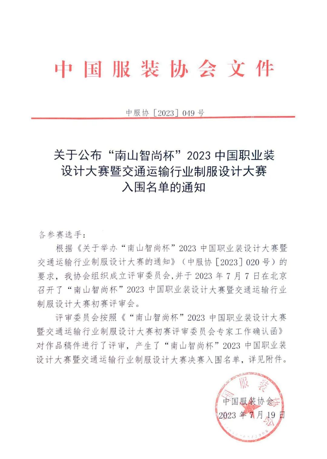 關(guān)于公布“南山智尚杯”2023中國職業(yè)裝設(shè)計大賽