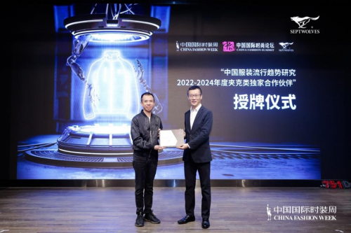 中國(guó)服裝設(shè)計(jì)師協(xié)會(huì)授予七匹狼“中國(guó)服裝流行趨勢(shì)研究獨(dú)家合作伙伴”牌匾,表彰七匹狼對(duì)中國(guó)服裝流行趨勢(shì)研究所做出的貢獻(xiàn)。