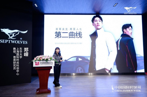 東華大學(xué)首席研究員鄭嶸現(xiàn)場(chǎng)講解《白皮書》,總結(jié) 2024 年度雙面夾克的三大設(shè)計(jì)趨勢(shì)主題。