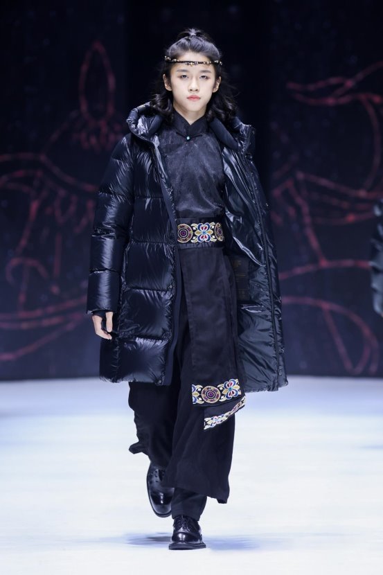 巴圖、博谷則身穿“藏地黑金”將高梵與92歲唐卡大師嘎瑪?shù)吕章?lián)名款展示給觀眾。“藏地黑金系列”選用了唐卡中的兩個圖騰,如意寶和智慧之劍。門襟處設(shè)計如意寶,代表著力量和智慧,象征著平安吉祥,如意寶上面的寶珠,傳說能治百病,同時有健康的寓意。這是大師在知曉圖案是給小孩穿的,就選出了最有代表性的圖騰,而在帽子上將高梵的LOGO和唐卡中的智慧之劍進行結(jié)合。