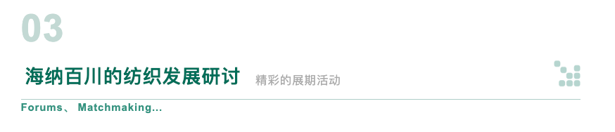 “海納百川的紡織發(fā)展研討”區(qū)域,則是一個(gè)開放包容、思想碰撞的平臺(tái)。這里將舉辦多場高端論壇與圓桌對話,特邀行業(yè)領(lǐng)袖、學(xué)者專家及企業(yè)精英,就紡織產(chǎn)業(yè)的全球趨勢、可持續(xù)發(fā)展策略、品牌建設(shè)與市場拓展等議題進(jìn)行深入探討。通過分享成功經(jīng)驗(yàn)、分析市場趨勢、預(yù)測未來走向,共同為紡織產(chǎn)業(yè)的繁榮發(fā)展貢獻(xiàn)智慧與力量。如同期將舉辦2024中國紡織新材料論壇、2024RCEP國際紡織產(chǎn)業(yè)峰會(huì)(紹興)、2024RCEP系列活動(dòng)-“新融合”亞洲品牌服飾趨勢交流會(huì)、2024RCEP系列活動(dòng)-“新突破”紡織品開發(fā)者大會(huì)、品牌專場自由對接會(huì)、2024新青年文化服飾論壇暨上下游產(chǎn)業(yè)對接活動(dòng)等。