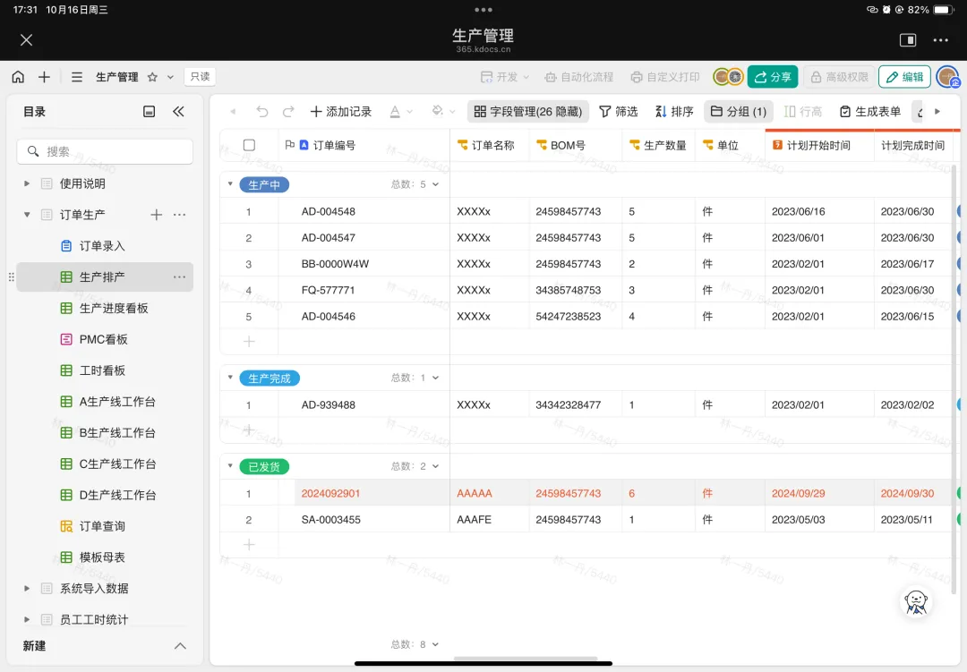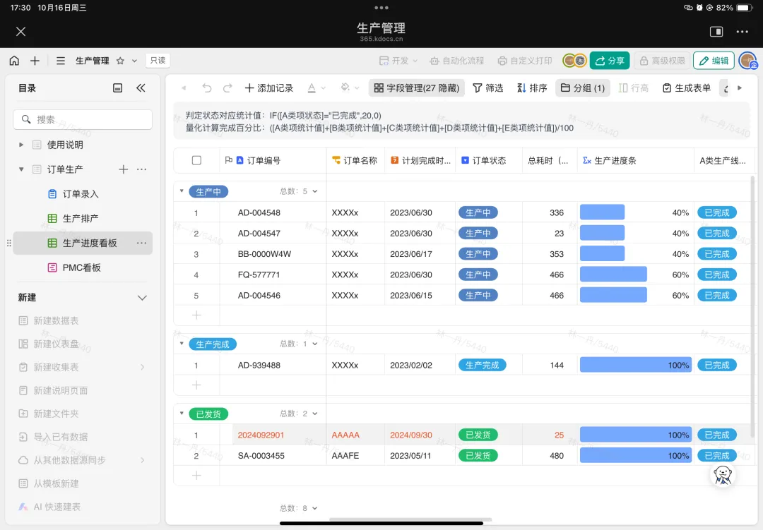 如今,年發(fā)紡織的員工可以隨時(shí)隨地辦公,不管是智能手機(jī)還是平板,都能實(shí)時(shí)錄入信息。同時(shí),使用者還可以在權(quán)限范圍之內(nèi)自定義流程、自定義打印,可以根據(jù)業(yè)務(wù)狀態(tài)靈活調(diào)整需求。與過(guò)去相比,訂單處理變得更加高效,倉(cāng)庫(kù)同事不需要在微信群中手動(dòng)記錄訂單數(shù)據(jù)再去進(jìn)行采購(gòu),業(yè)務(wù)員只需將訂單通過(guò)表單提交到多維表中,倉(cāng)庫(kù)同事即可根據(jù)多維表中的數(shù)據(jù)進(jìn)行采購(gòu)和發(fā)貨。庫(kù)房發(fā)貨后,快遞單號(hào)也會(huì)被填寫到多維表中,系統(tǒng)會(huì)自動(dòng)發(fā)送信息到群里,告知業(yè)務(wù)員訂單已發(fā)出及單號(hào)。有了多維表格,不僅減少了業(yè)務(wù)員的詢問(wèn)工作的次數(shù),也提高了客戶的滿意度。