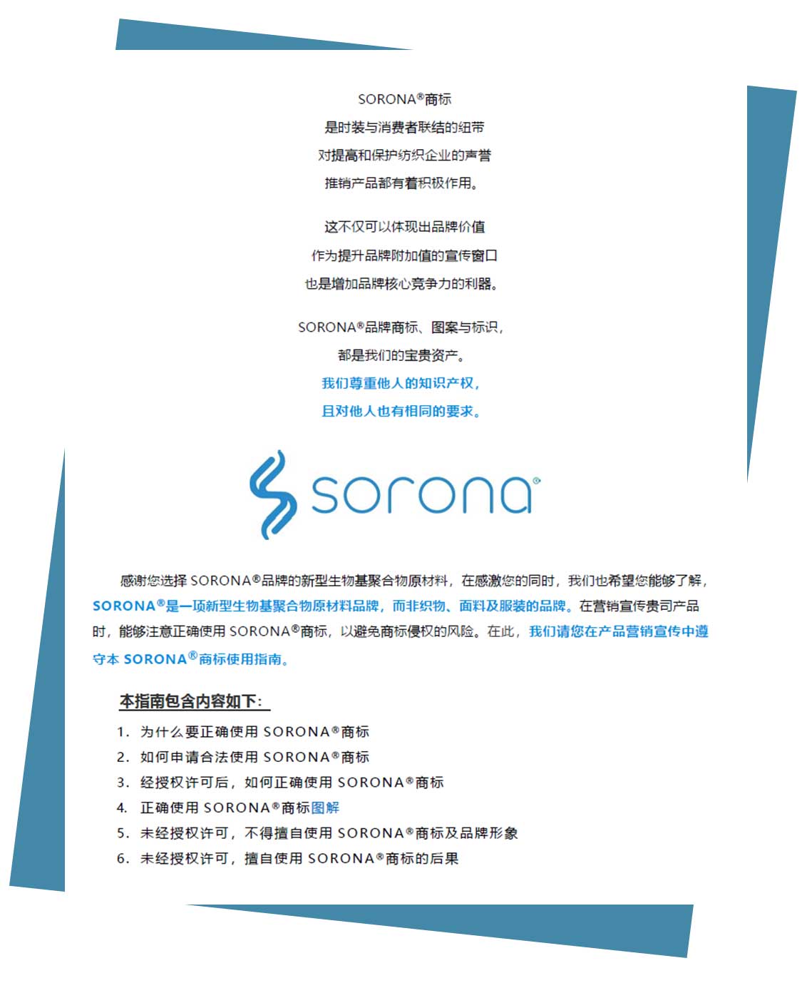 未經(jīng)獲得書面許可,任何公司和實(shí)體都不得在工業(yè)用化學(xué)品、纖維、紗、線、服裝、地毯等商品類別上使用SORONA®商標(biāo)標(biāo)識(shí)。即使您在SORONA®授權(quán)經(jīng)銷渠道購(gòu)買并使用了SORONA®品牌材料,如未獲得我司直接授權(quán),任何人不得在產(chǎn)品宣傳和介紹中使用 SORONA®名稱及商標(biāo)形象,不得有損SORONA®品牌形象,或出現(xiàn)誤導(dǎo)公眾的現(xiàn)象。所有含有SORONA®商標(biāo)標(biāo)識(shí)的營(yíng)銷推廣資料需要先經(jīng)SORONA®團(tuán)隊(duì)審核通過(guò)后方可使用。