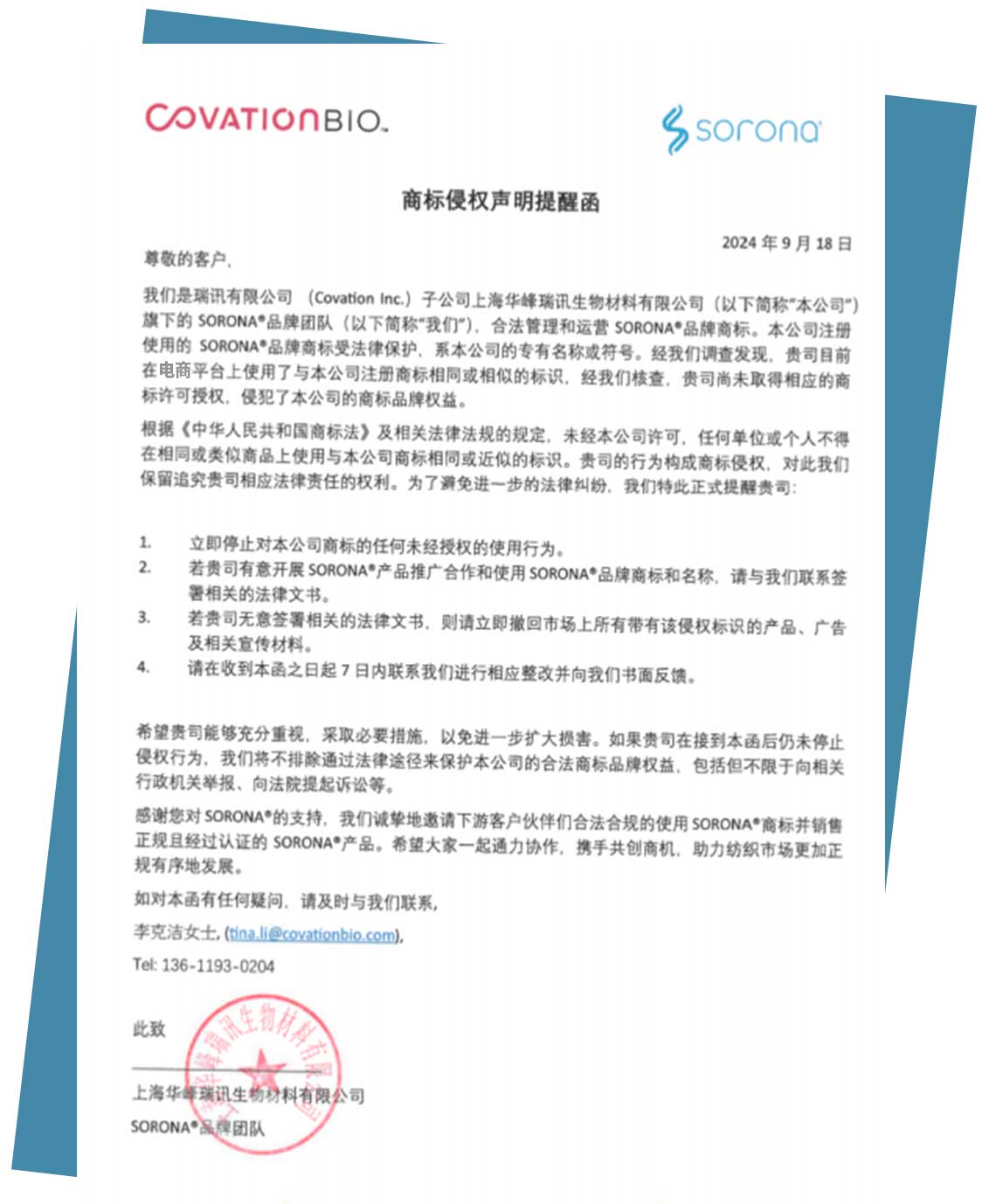 如果您想向我們申請(qǐng)使用SORONA®商標(biāo),需要簽署一份“商標(biāo)使用許可協(xié)議” 由此成為SORONA®商標(biāo)的使用許可人,進(jìn)而可以在產(chǎn)品包裝、標(biāo)簽、廣告等宣傳方式和宣傳物料中使用SORONA®品牌標(biāo)示圖(logo),凸顯SORONA®的品牌形象。需要注意的是,凡是使用了SORONA®商標(biāo)的商品及宣傳物料,須提交SORONA®營(yíng)銷傳播部門進(jìn)行審批通過(guò)后,方可上市。上市后如需對(duì)商品及宣傳物料作任何改變,須重新提交SORONA®營(yíng)銷傳播部門審批。如需申請(qǐng)成為SORONA®品牌許可人,敬請(qǐng)聯(lián)系:Tina.li@covationbio.com