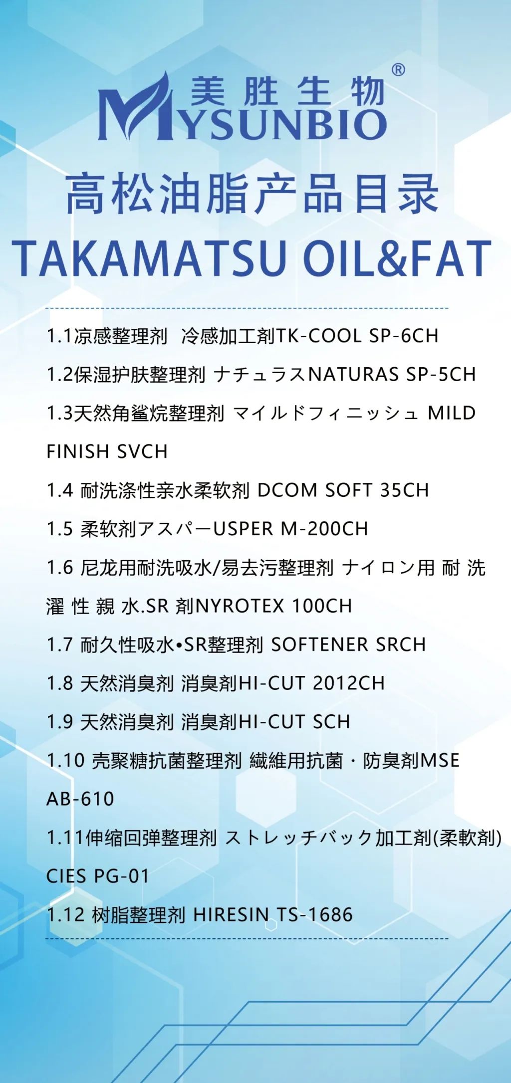 高松油脂成立于1952年,是一家具有70多年歷史的精細(xì)化學(xué)品生產(chǎn)企業(yè)。其主要生產(chǎn)經(jīng)營表面活性劑、合成樹脂產(chǎn)品??偣静课挥谌毡敬筅?,東京設(shè)有專門負(fù)責(zé)銷售的分公司,生產(chǎn)和研發(fā)基地設(shè)在日本北陸石川縣。創(chuàng)業(yè)初期,原設(shè)在日本兵庫縣西宮市的工廠以乳化技術(shù)獨(dú)居行業(yè)領(lǐng)先,當(dāng)時(shí)主要以棉用柔軟劑樹脂的生產(chǎn)與銷售為主。隨著日本國內(nèi)化纖使用的增加,工廠移至日本海的北陸石川縣(滌綸、尼龍等化纖的生產(chǎn)基地),產(chǎn)品更加豐富多樣。高松油脂泰國分工廠于2001年成立,并獲得Bluesign認(rèn)證。高松油脂基于在纖維領(lǐng)域研究了多年的技術(shù),其產(chǎn)品應(yīng)用于化學(xué)產(chǎn)品、紡織品、紙張、薄膜和金屬等各基材表面,賦予材料高性能價(jià)值。