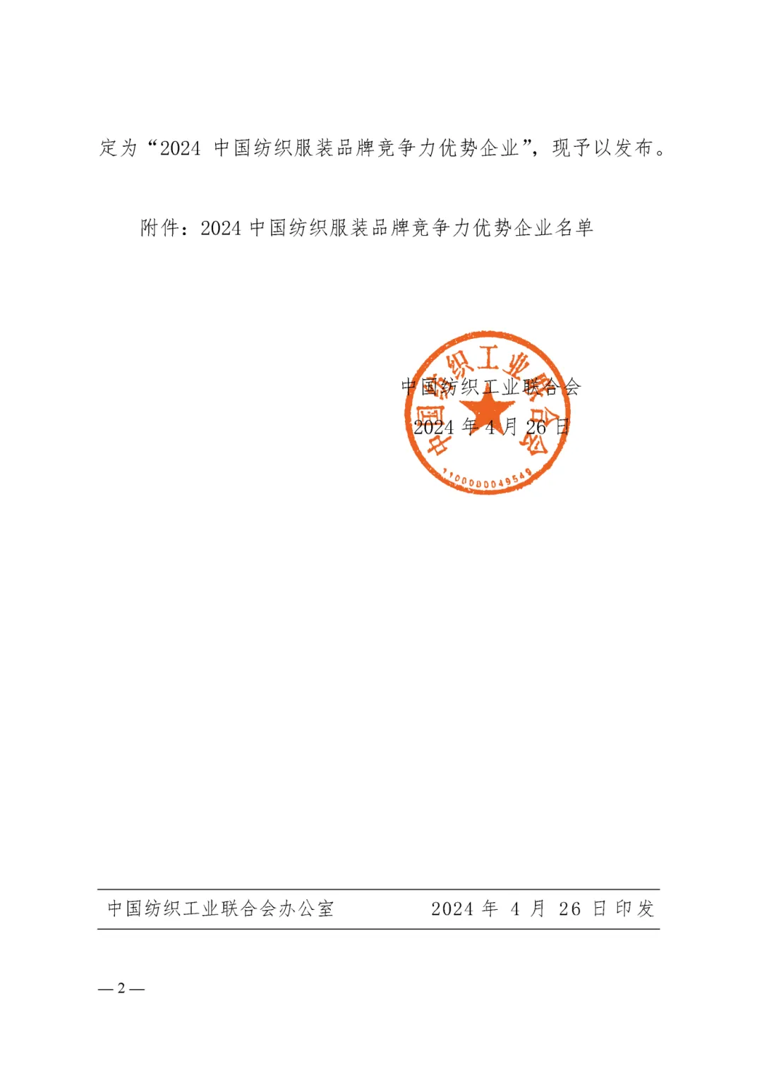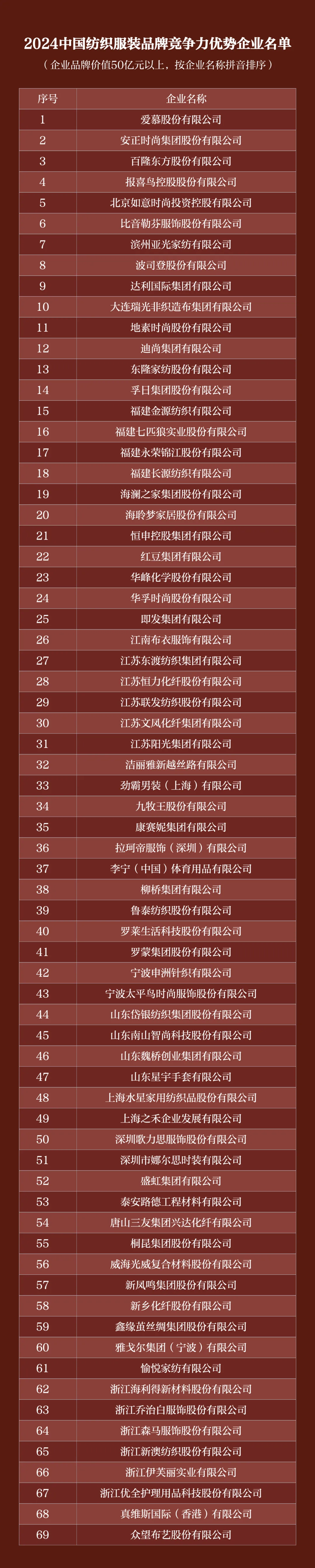 會議還正式發(fā)布了“2024中國紡織服裝品牌競爭力優(yōu)勢企業(yè)”名單,展示中國紡織服裝品牌培育工作成果。