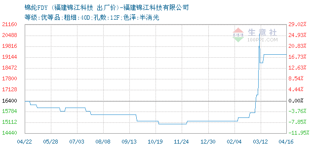 12月11日福建錦江科技有限公司關(guān)于錦綸FDY的報價為15200元/噸。錦綸FDY的規(guī)格:等級:優(yōu)等品;粗細(xì):40D;孔數(shù):12F;色澤:半消光。該報價有效期為3天。報價提供方:福建錦江科技有限公司。