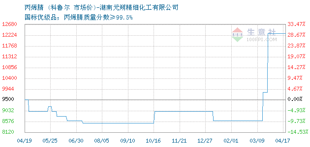 12月15日科魯爾關(guān)于丙烯腈的報(bào)價(jià)為9000元/噸。丙烯腈的規(guī)格:國(guó)標(biāo)優(yōu)級(jí)品;丙烯腈質(zhì)量分?jǐn)?shù)≥99.5%。該報(bào)價(jià)有效期為3天。報(bào)價(jià)提供方:湖南元朔精細(xì)化工有限公司。
