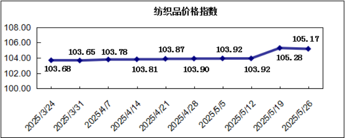 “中國·柯橋紡織指數(shù)” 20250526期紡織品價格指數(shù)收報于105.17點(diǎn),環(huán)比下跌0.11%,較年初上漲0.61%,去年同比上漲0.12%。
