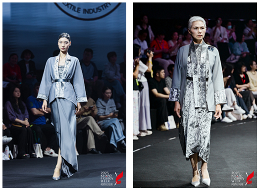 作為“現(xiàn)代漢民族民族服”的核心載體,本次大秀系統(tǒng)呈現(xiàn)四大著裝標(biāo)準(zhǔn),完成從禮儀服飾到生活方式的文化轉(zhuǎn)譯。秀場內(nèi),燈光聚焦在T臺(tái)中央,如夢如幻。隨著音樂響起,模特們身著商務(wù)正裝系列緩緩登場。碳灰、中灰、珍珠灰等專業(yè)灰色系服飾,在模特們自信的步履間,傳遞出專業(yè)穩(wěn)重的氣質(zhì)。立領(lǐng)、對(duì)襟等傳統(tǒng)細(xì)節(jié)與優(yōu)化后的肩部剪裁、修身版型相得益彰,經(jīng)典與現(xiàn)代審美完美融合,贏得現(xiàn)場陣陣贊嘆。
