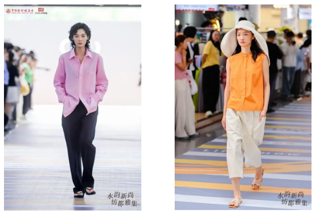 值得一提的是,本次走秀T臺(tái)縱穿整個(gè)東市場(chǎng)主通道,巧妙連接?xùn)|市場(chǎng)室內(nèi)與“水韻紡都”沿河區(qū)域,形成一道亮麗的風(fēng)景線,既體現(xiàn)了現(xiàn)代時(shí)尚感,又融入了東市場(chǎng)的文化底蘊(yùn)。同時(shí),現(xiàn)場(chǎng)設(shè)置“東市霓境”靜態(tài)展,以運(yùn)河沿岸的花草樹(shù)木為背景,動(dòng)與靜之間,盡顯柯橋紡織時(shí)尚魅力。