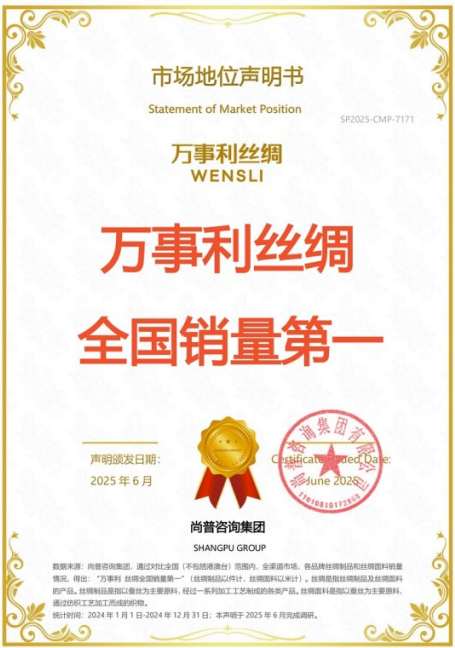2025年6月,尚普咨詢集團對絲綢制品及絲綢面料開展了專項研究,從行業(yè)趨勢、競爭格局、企業(yè)經(jīng)營等方面針對行業(yè)進(jìn)行了全面、系統(tǒng)、廣泛而深入的調(diào)研,以呈現(xiàn)萬事利在行業(yè)中的市場地位。此次萬事利榮獲尚普咨詢【萬事利 絲綢全國銷量第一】聲明,不僅確立了萬事利在行業(yè)內(nèi)的標(biāo)桿地位,彰顯了中國絲綢企業(yè)的品牌影響力與引領(lǐng)作用,也充分印證了傳統(tǒng)絲綢產(chǎn)業(yè)在創(chuàng)新驅(qū)動下煥發(fā)出的蓬勃生機。