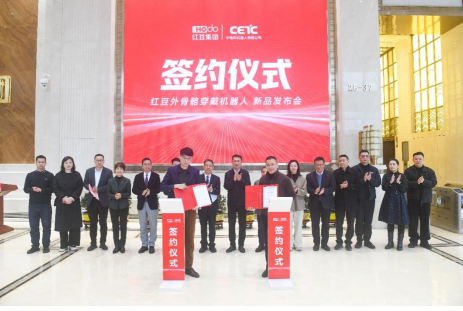 科技共生,未來已來。2月5日,紅豆集團(tuán)旗下無錫福芯機(jī)器人有限公司與中國電子科技集團(tuán)公司旗下中電科機(jī)器人有限公司在無錫正式簽約合作,并共同發(fā)布首款合作成果——輕量型髖關(guān)節(jié)助力外骨骼機(jī)器人。紅豆集團(tuán)董事局主席周海江出席發(fā)布會(huì)并發(fā)言。中國電科第21研究所副總工程師、機(jī)器人研發(fā)中心主任王洪武,紅豆股份董事、無錫福芯機(jī)器人公司總經(jīng)理奚豐作為雙方代表進(jìn)行簽約。