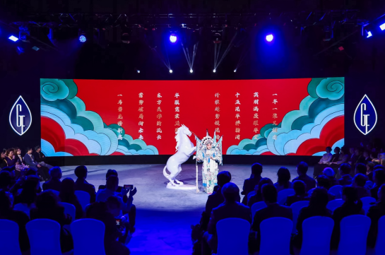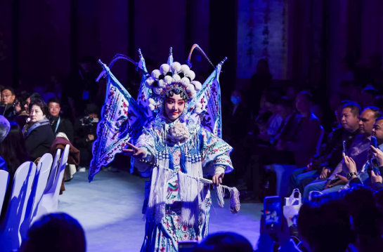 大秀啟幕,京腔雅韻先聲奪人。京劇新生代演員,一襲綾羅青衫頭戴鳳冠,恍若仙子凌波、自云端降世。行至臺(tái)前,八句京腔念白字字珠璣,一念一韻,一白一境,古韻與時(shí)尚在這一刻隔空和鳴。馬鞭輕揚(yáng),東方美學(xué)大幕正式拉開(kāi);光影流轉(zhuǎn)間,五十套高定華服次第登場(chǎng),鋪展成一幅流動(dòng)的東方美學(xué)畫(huà)卷。